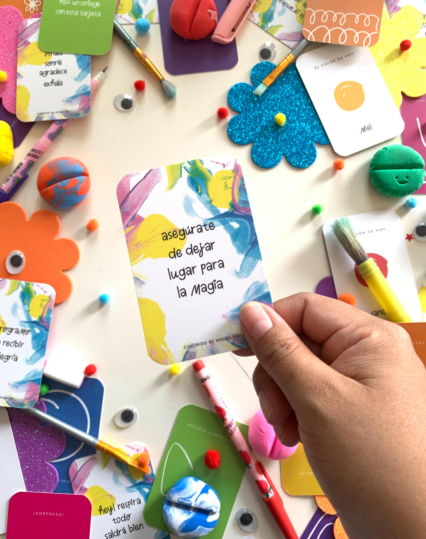 COLORIDO!Cuando creé este producto, no pensaba en 'que se vea lindo.' Pensaba en una Chispa✨En como estamos en el día a día corriendo y se nos olvida que tenemos una chispa creativa dentro, recordarnos como nos hablamos, en cómo sin darnos cuenta nos programamos con todo lo que leemos en redes, libros, en tu sketch, todo lo que nos rodea.Y pensé… ¿y si hago unas tarjetas que me ayuden a activar esa chispa?Así nació el 🌈DECK CREATIVO COLORIDO!✨ Como anclas para recordarme y activarme. Como hechizos mágicos creativos. Como abrazos inspiradores en forma de palabras y del otro lado de la tarjeta actividades creativas que te activan.Te presento tu nuevo amigo, el deck Colorido!:
