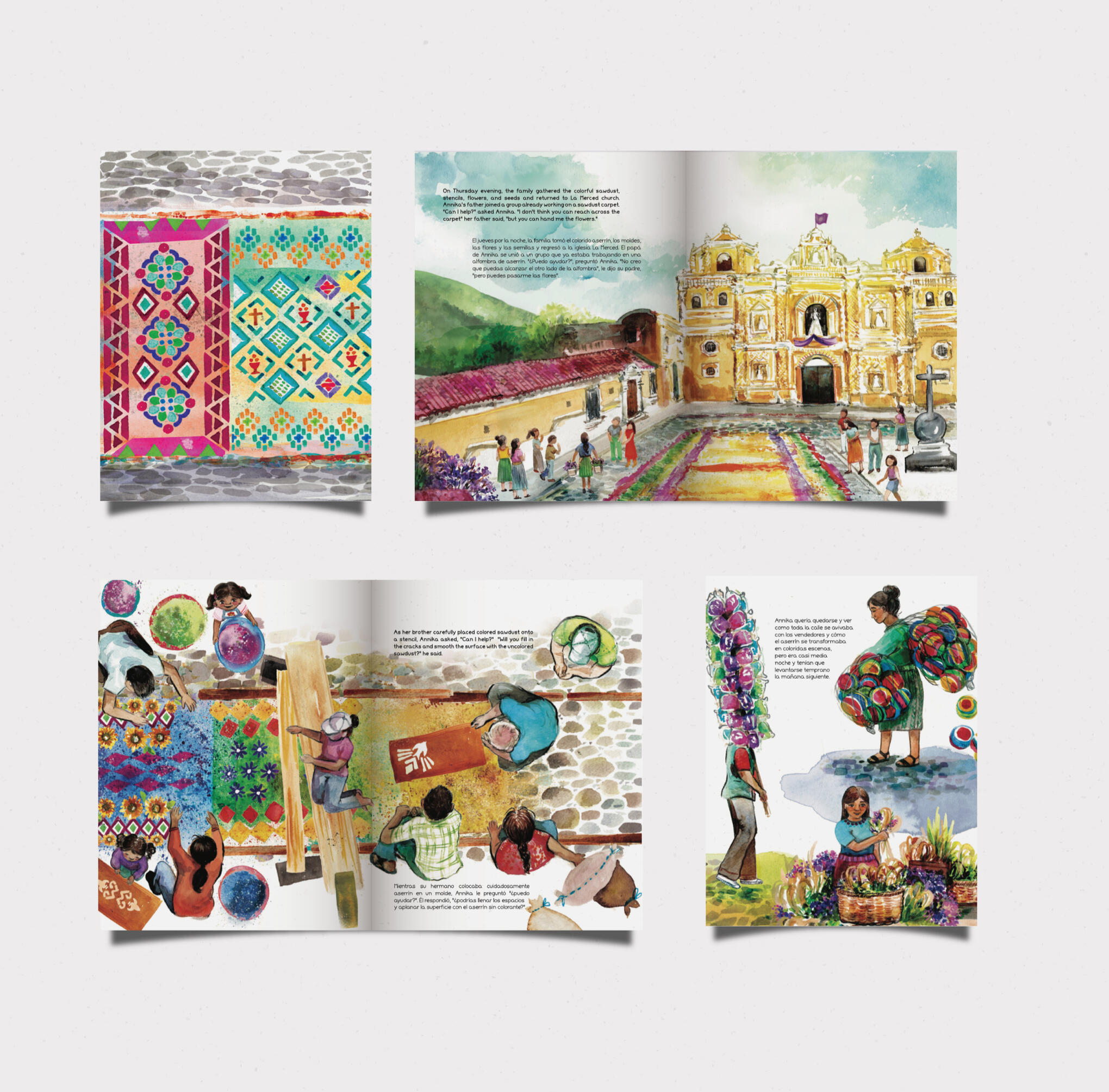 Diseño gráfico editorialEl libro bilingüe Antigua's Amazing Sawdust Carpets/Las increíbles alfombras de aserrín de Antigua, cuenta la historia de una familia antigüeña y una pequeña Annika con una pregunta que hace durante toda la Semana Santa a su familia "¿Puedo ayudar?".Vista Tranquila es una Editorial que cuenta historias guatemaltecas y soy la encargada de organizar el "rompecabezas" entre escritora, ilustradora y piezas finales para crear libros que cuenten una historia pero también te atrapen visualmente.Escrito por Kimberly Pitts