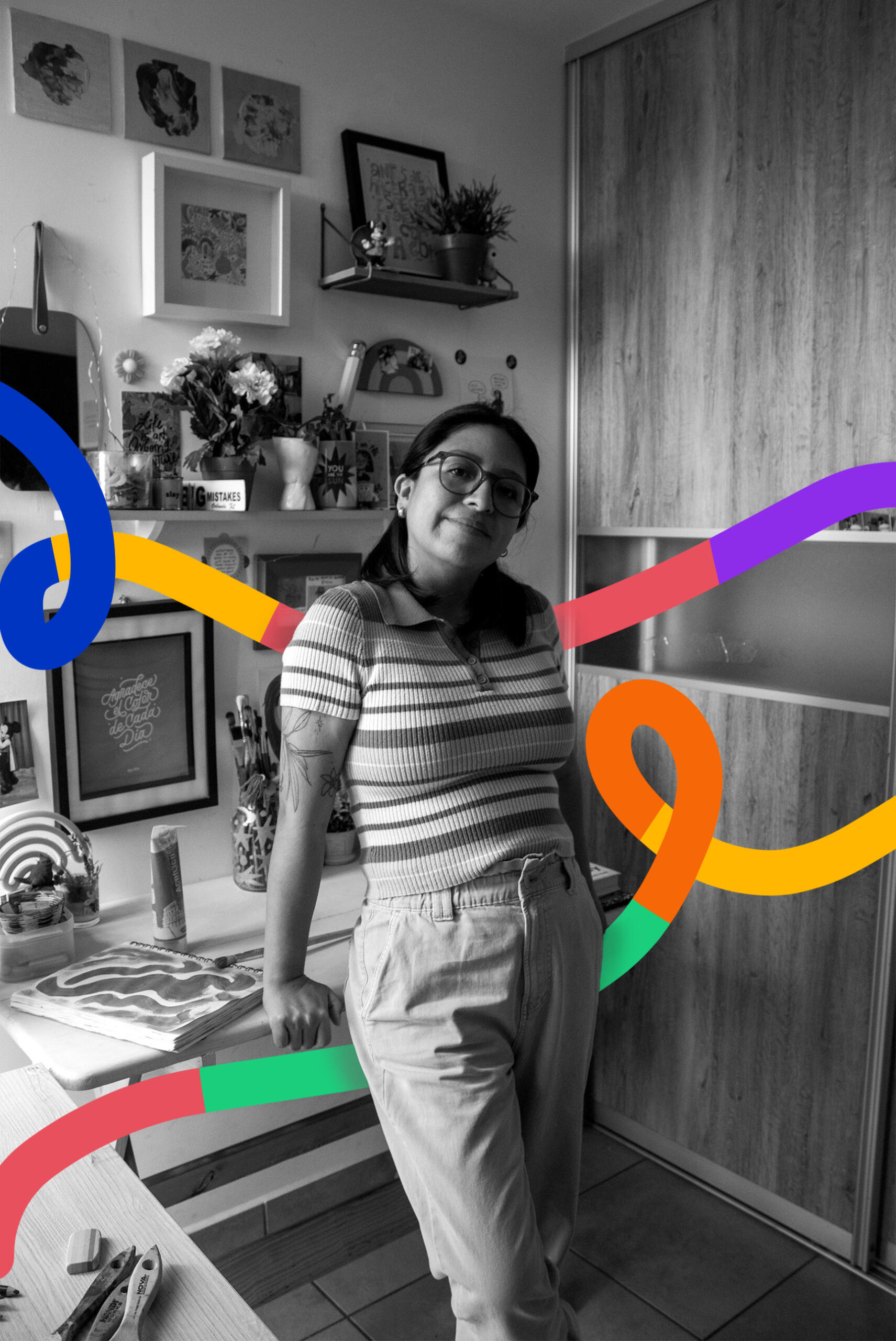 Mi manera de diseñar y enseñar está enfocada en la creatividad, es decir, a la resolución de problemas a través de piezas gráficas creadas durante la experimentación y diversión, que son parte fundamental de mi proceso. Intentando, fallando pero brillando es mi mantra diario que me ayuda a navegar entre los proyectos del día a día.Si no estoy diseñando o dibujando, me encuentras manchada de pintura por mis experimentos, tomando un café, paseando a Dory o viendo películas con Javi mientras bailamos Caloncho.